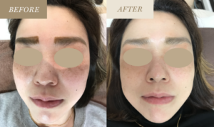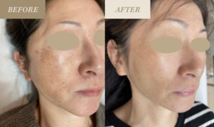 | 治療後 | 初回から3回目までは目に見えた効果はあまり現れませんが、肌のキメなどの改善実感が期待できます。 一般的には5回程度の照射を超えたところから色調の改善を実感し始めることが多いです。くすみや肝斑は周囲の薄い部分から改善し始めます。 また治療を続けると、以前はくすみや肝斑に隠れていた「シミ」が見えやすくなるため、シミが増えたと感じることがあります。 |